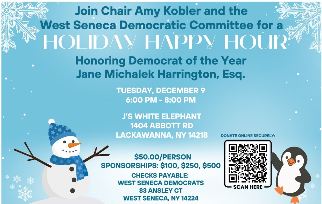 Join the West Seneca Democrats for a Holiday Happy Hour celebrating our Democrat of the year, Jane Michalek Harrington, Esq.